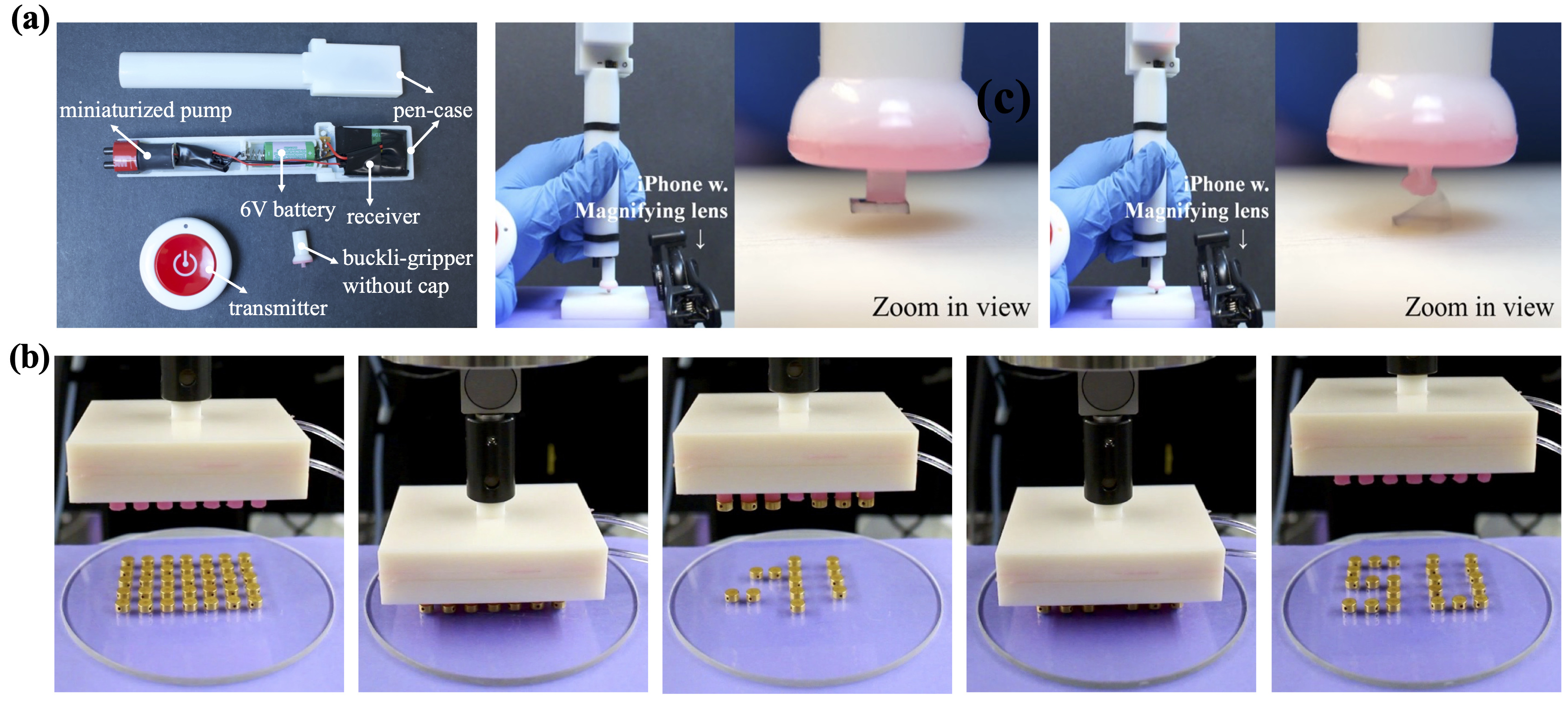 Figure 5: Demonstration of versatility of SHP with dynamically tunable adhesion in (a) a tetherless gripper, and (b) a device with arrays of SHPs for selective object manipulation [9].