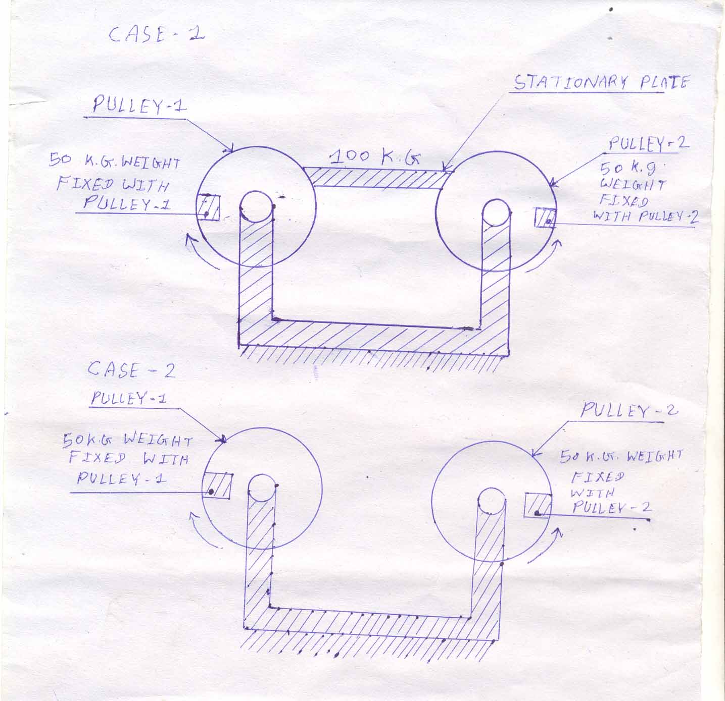 In second case two pulleys of same diameter. 50 k.g weight is also fixed with each pulley, but there is no stationary plate and 100 k.g weight. Now we try to rotate slowly first pulley in clockwise direction and second pulley in anti clockwise direction.
